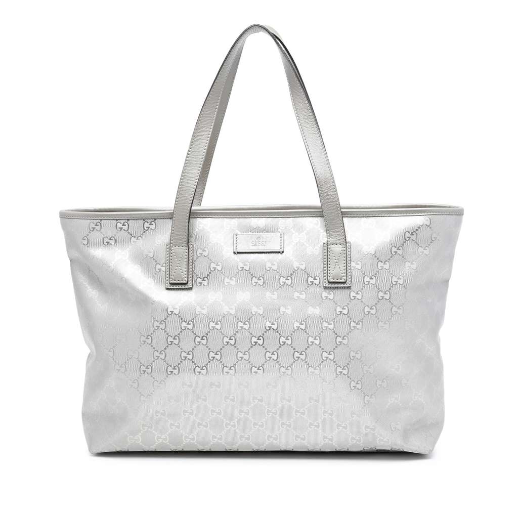 This tote bag features a coated canvas body, flat leather straps, a top zip closure, and interior slip and zip pockets.