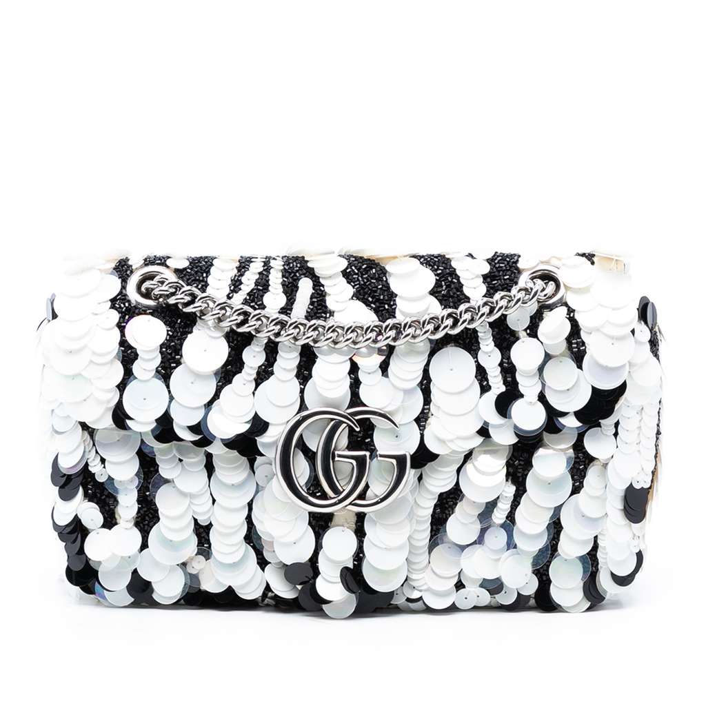 This shoulder bag features a sequined leather body, a curb chain shoulder strap, a front flap with a push lock closure, and an interior zip pocket.
