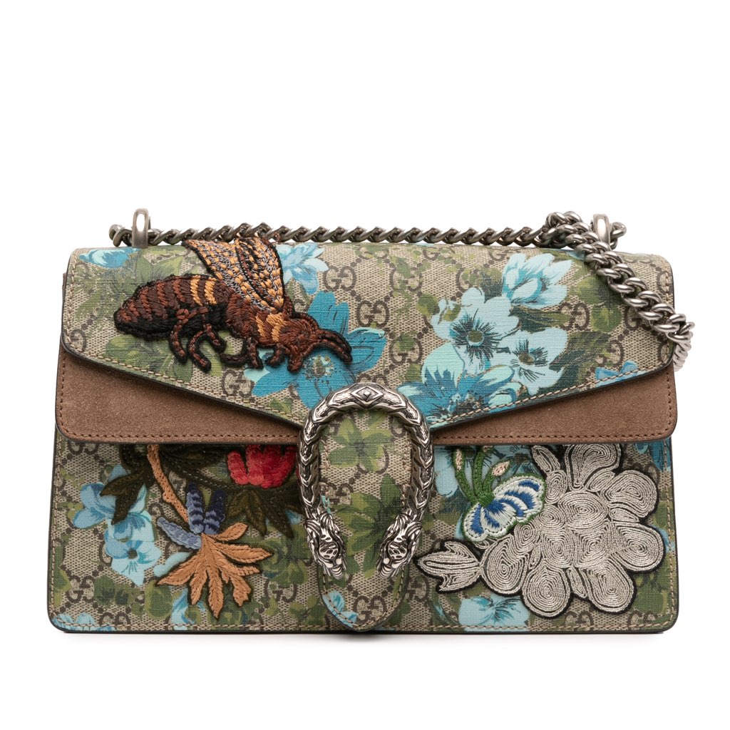 The Dionysus features a coated canvas body with embroidery details, chain link straps, a top flap with push lock closure, and an interior zip compartment.