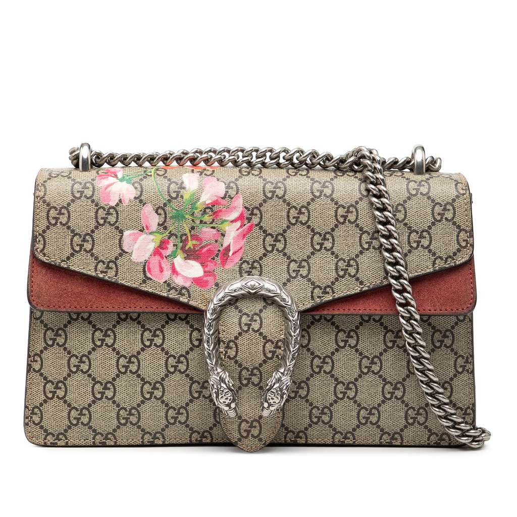 This Dionysus features a coated canvas body with suede leather trim, a chain link shoulder strap, a front flap with push lock closure, and interior zip and slip compartments.