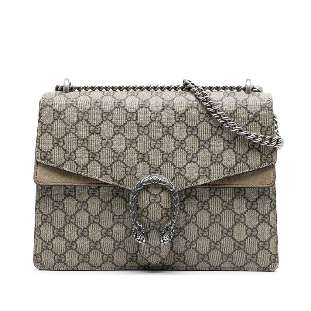 The Dionysus features a coated canvas body with suede trim, silver toned chain strap, a top flap with snap closure, an exterior seude slip pocket, and an interior zip pocket.
