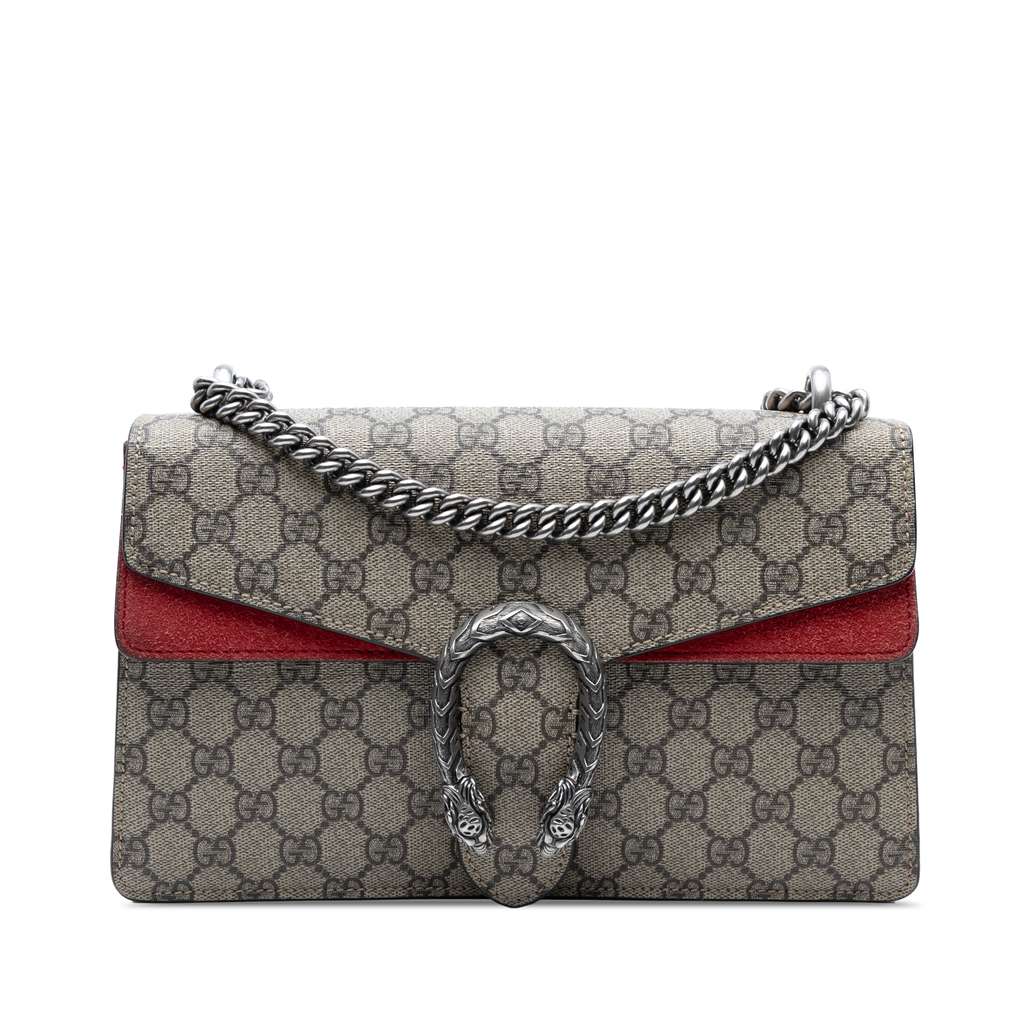The Dionysus features a coated canvas body with suede leather trim, a silver-tone curb chain shoulder strap, a front flap with push lock closure, and an interior zip compartment.