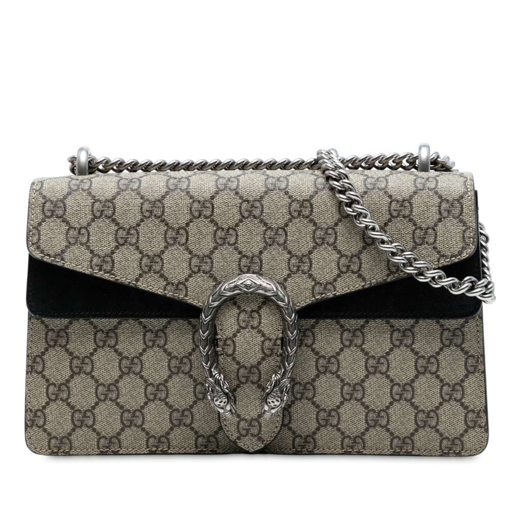The Dionysus features a coated canvas body with suede leather trim, a silver-tone curb chain shoulder strap, a front flap with push lock closure, and an interior zip compartment.