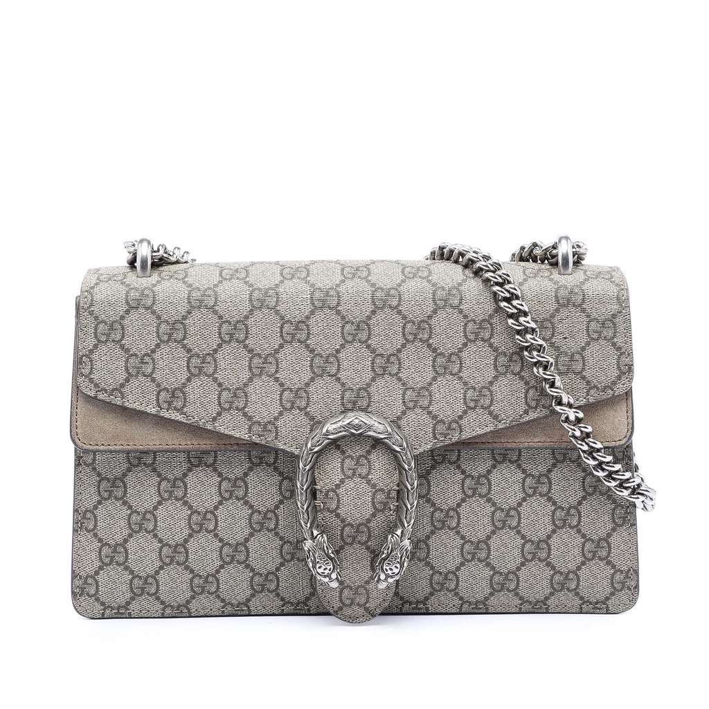 The Dionysus features a coated canvas body with suede leather trim, a silver-tone curb chain shoulder strap, a front flap with push lock closure, and an interior zip compartment.