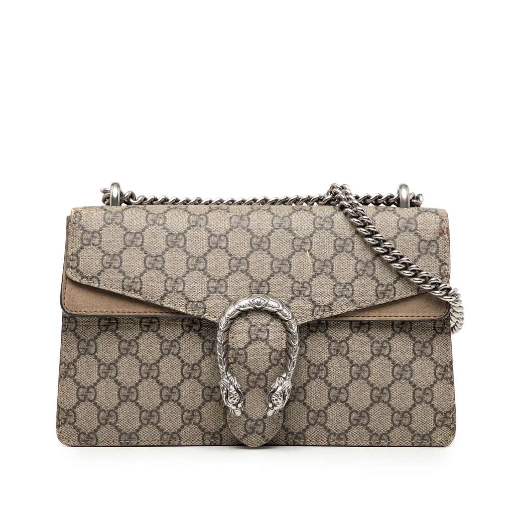 The Dionysus features a coated canvas body with suede leather trim, a silver-tone curb chain shoulder strap, a front flap with push lock closure, and an interior zip compartment.