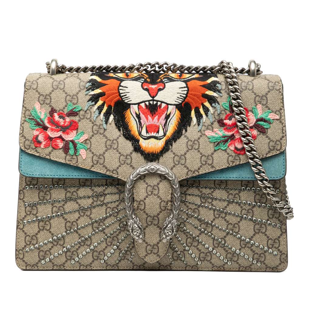 The Dionysus features a coated canvas body with suede trim, a sliding curb chain link strap, a flap with magnetic snap closure, an exterior back slip pocket, and an interior zip pocket.