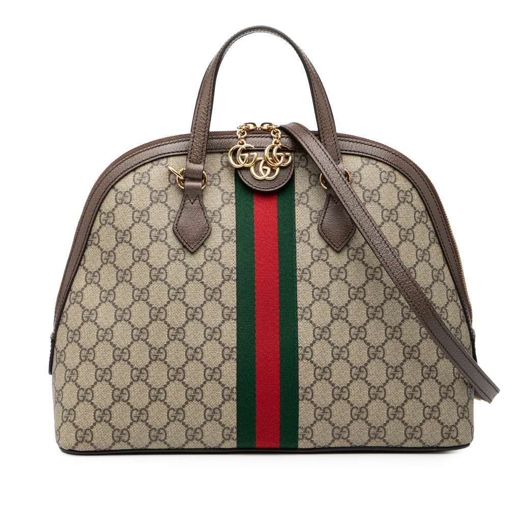 The Ophidia satchel features a coated canvas body with leather trim with web detail, flat leather handles, a detachable flat leather strap, a top zip closure, and interior zip and slip pockets.