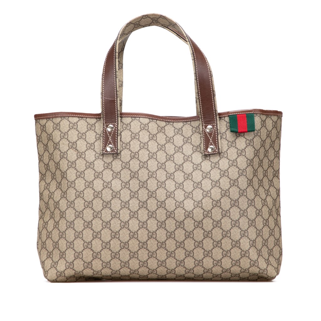 This tote bag features a coated canvas body with leather trim, flat leather handles, an open top, and an interior slip pocket.
