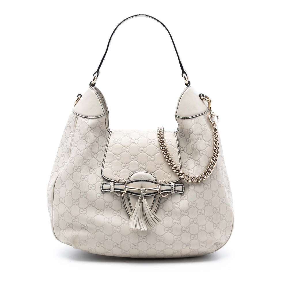The Emily features an embossed leather body, a flat leather strap, a detachable chain link strap with leather shoulder guard, a top flap with a tuck closure, and interior zip and open pockets.