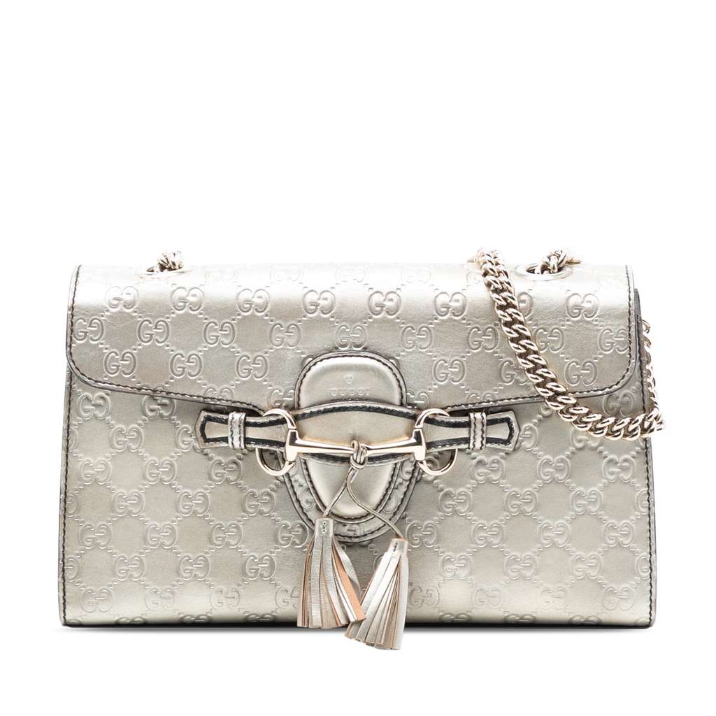 The Emily features an embossed leather body, a chain link strap with leather guard, a front flap with a slip-through closure and a tassel detail, and interior slip pockets.