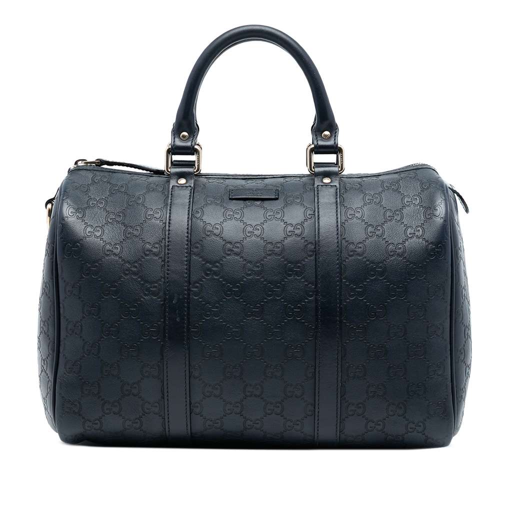 The Joy boston bag features an embossed leather body, rolled leather handles, a top zip closure, and an interior slip pocket.