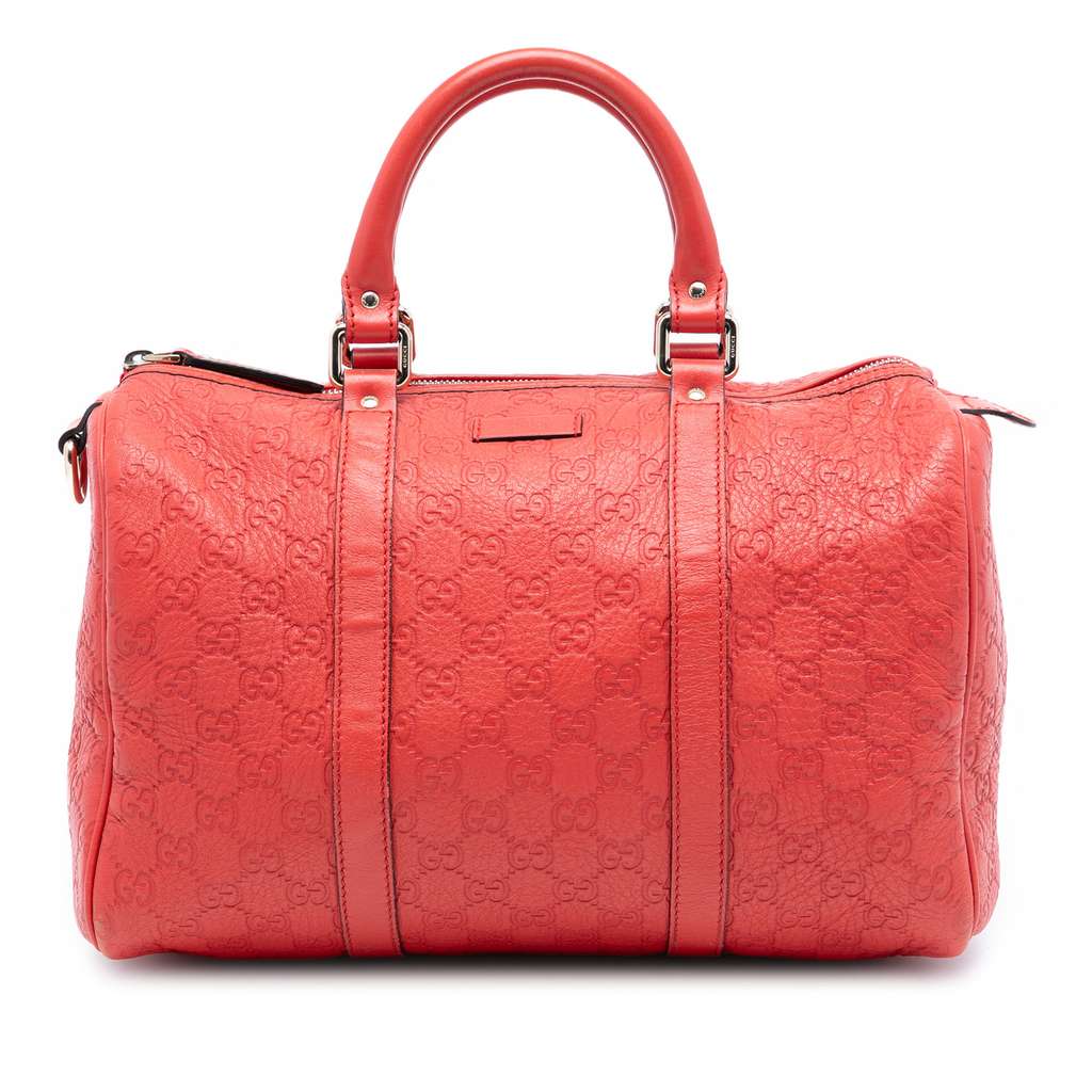This boston bag features an embossed leather body, rolled leather handles, a top zip closure, and an interior slip pocket.