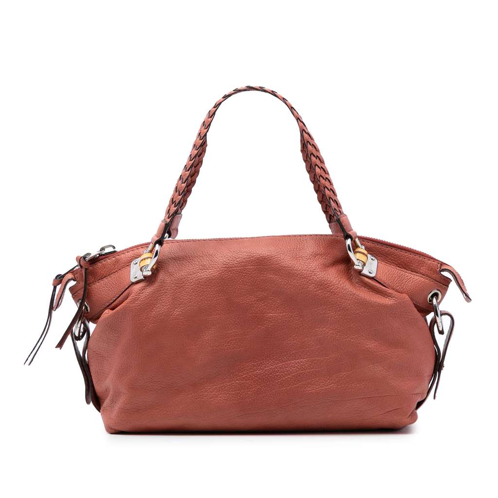 This tote features a leather body, braided leather straps, a top zip closure, and interior zip and slip pockets.