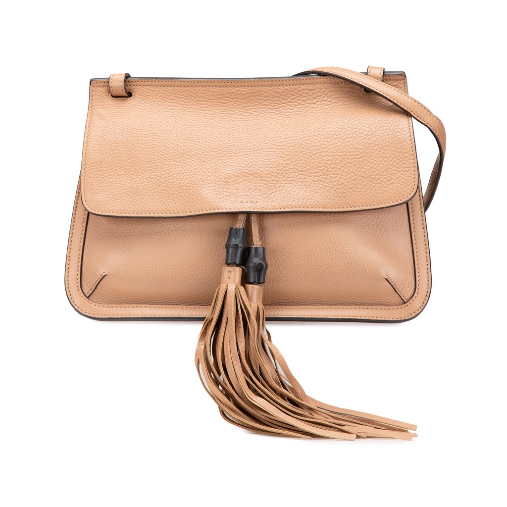 The Bamboo Daily features a leather body with bamboo-accented leather tassels, an adjustable flat leather strap, a front flap with magnetic snap closure, and interior zip and slip pockets.