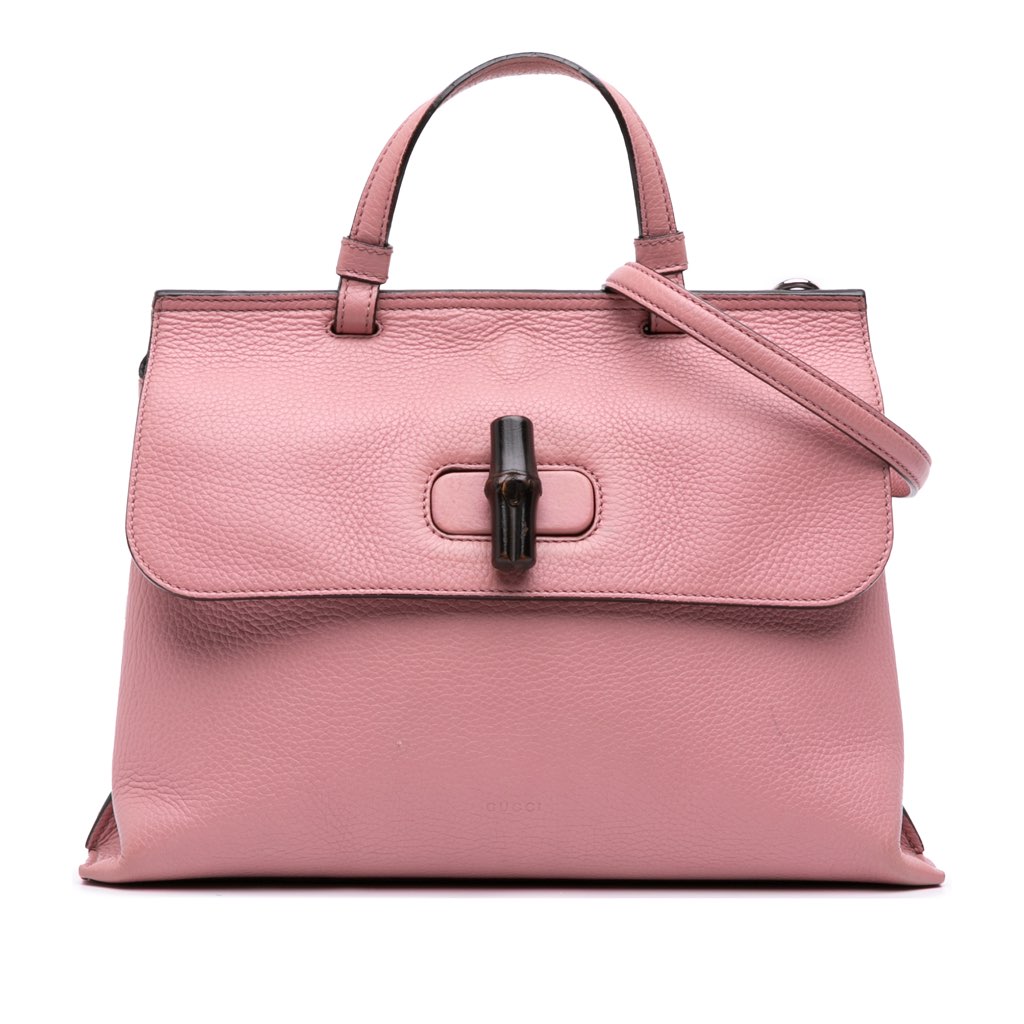The Daily satchel features a leather body, a flat top handle, a detachable flat leather strap, a front flap with a bamboo bullet twist lock closure, and interior zip and slip pockets.