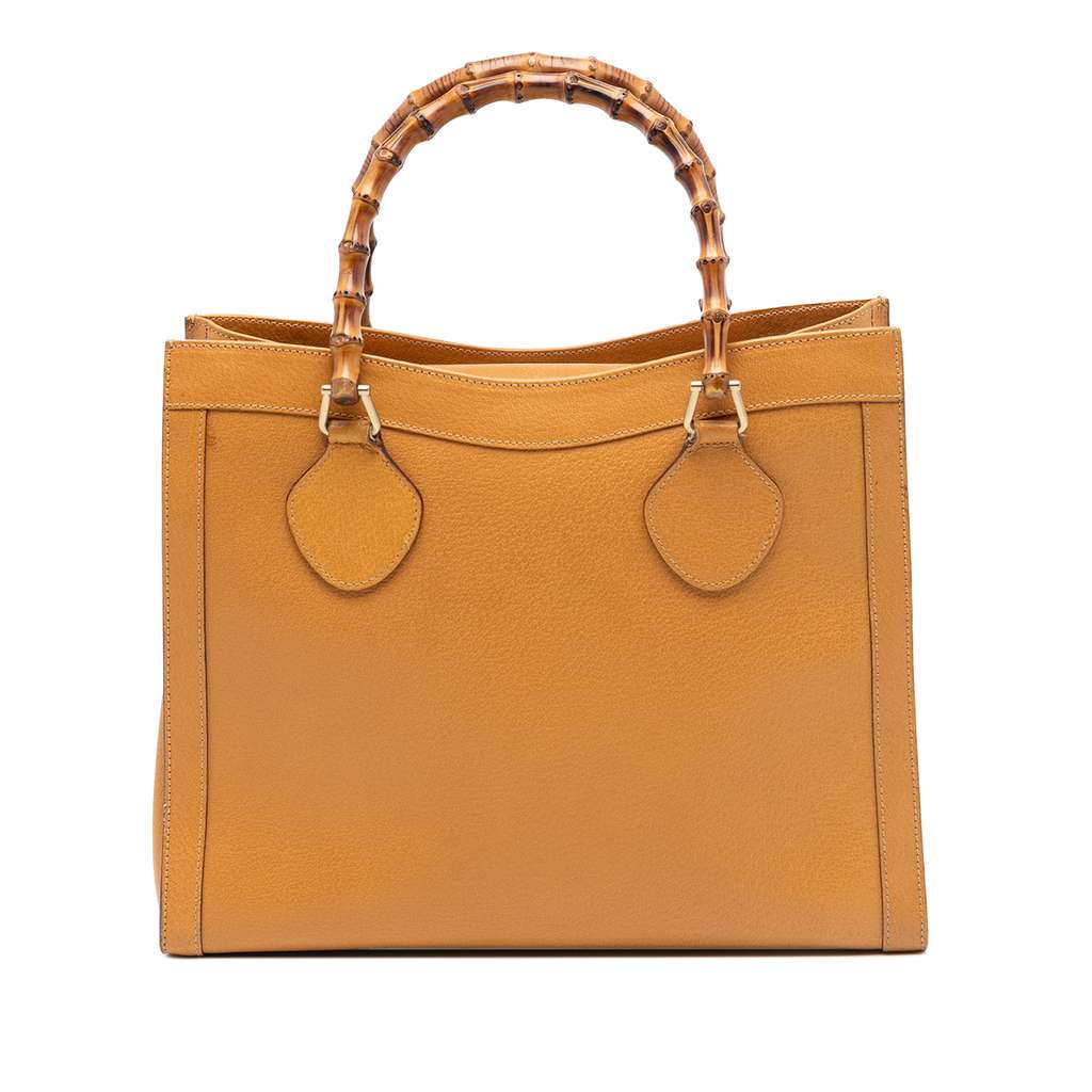 The Diana tote bag features a leather body, bamboo top handles, an open top with magnetic snap closure, an interior zip compartment, and an interior zip pocket.