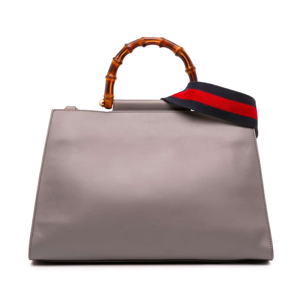 The Nymphaea features a leather body, a bamboo handle, a detachable strap, an open top with magnetic closure, and interior zip and slip pockets.