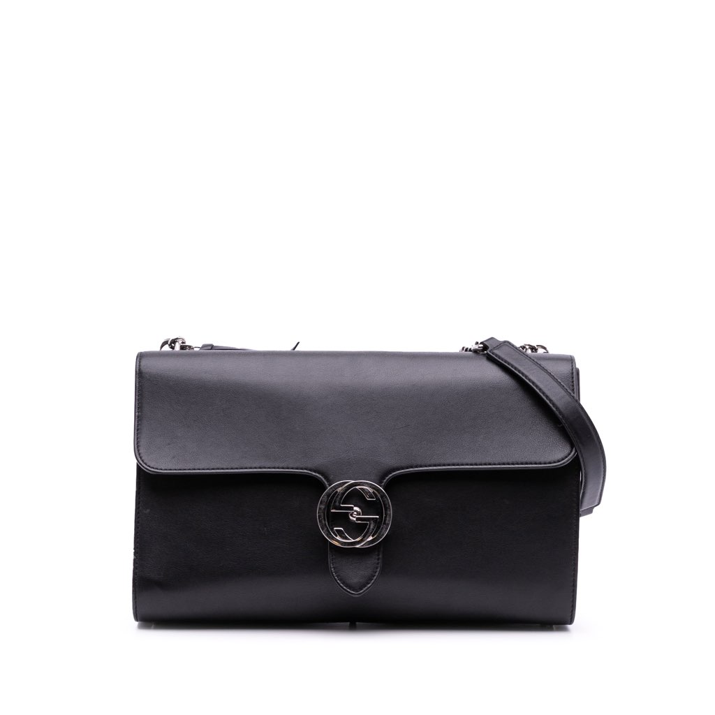 This crossbody bag features a polished leather body, a chain link shoulder strap, a flap with GG flip-lock closure, and interior zip and slip pockets.