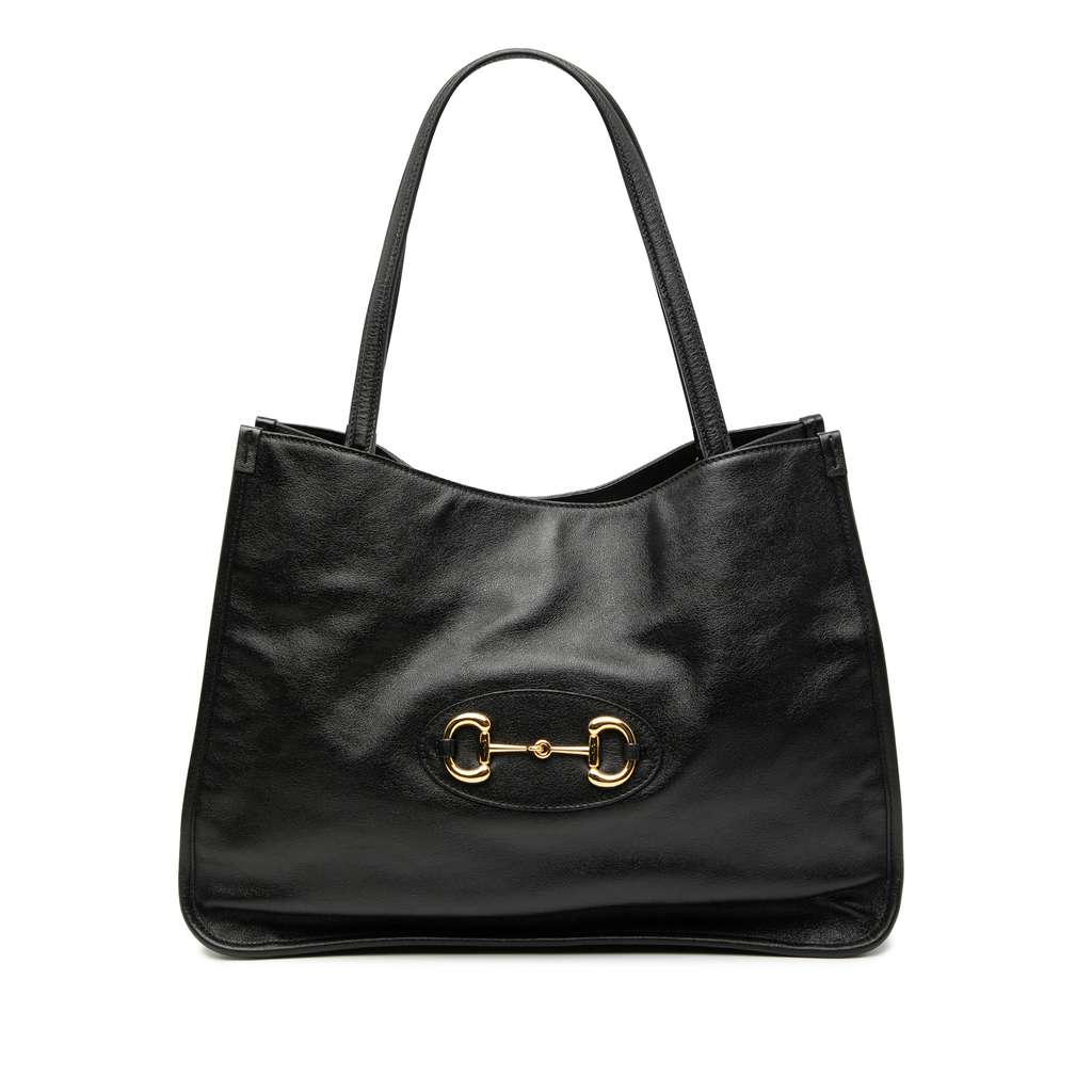 This tote bag features a leather body, flat leather shoulder straps, an open top with magnetic snap closure, and interior zip and slip pockets.
