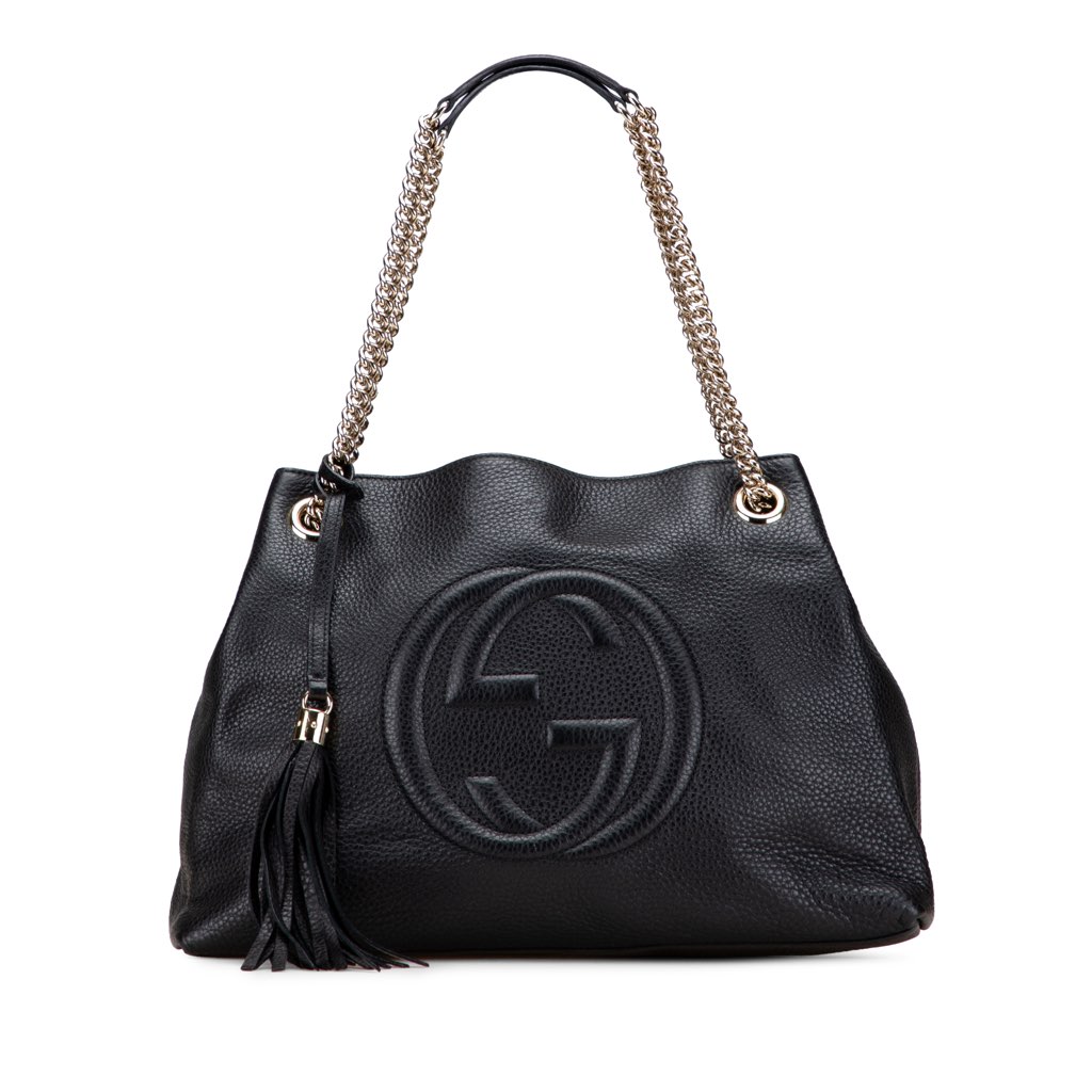 The Soho Chain features a leather body, chain link straps with leather guard, an open top with a lobster clasp closure, and interior zip and slip pockets.