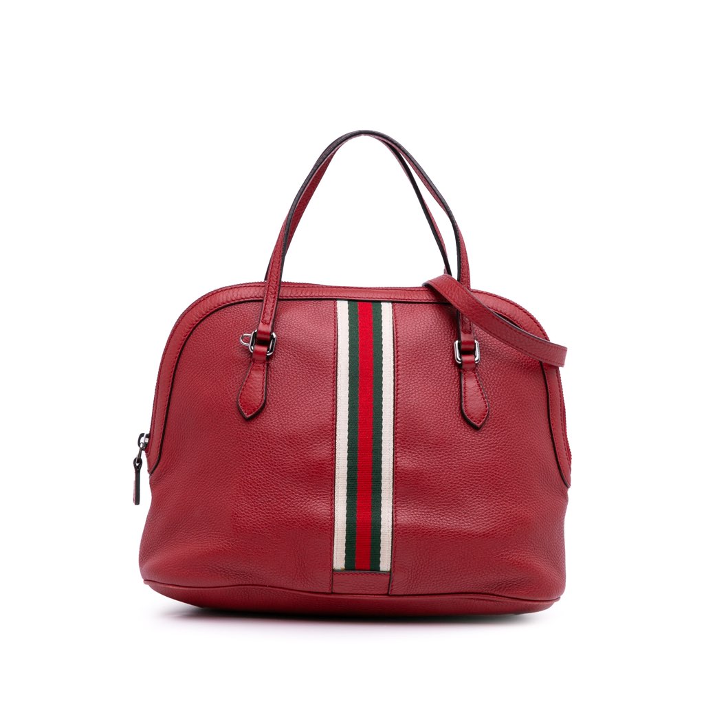 This satchel features a leather body with web details, flat leather handles, a detachable flat leather shoulder strap, a top zip closure, and interior and zip slip pocket.