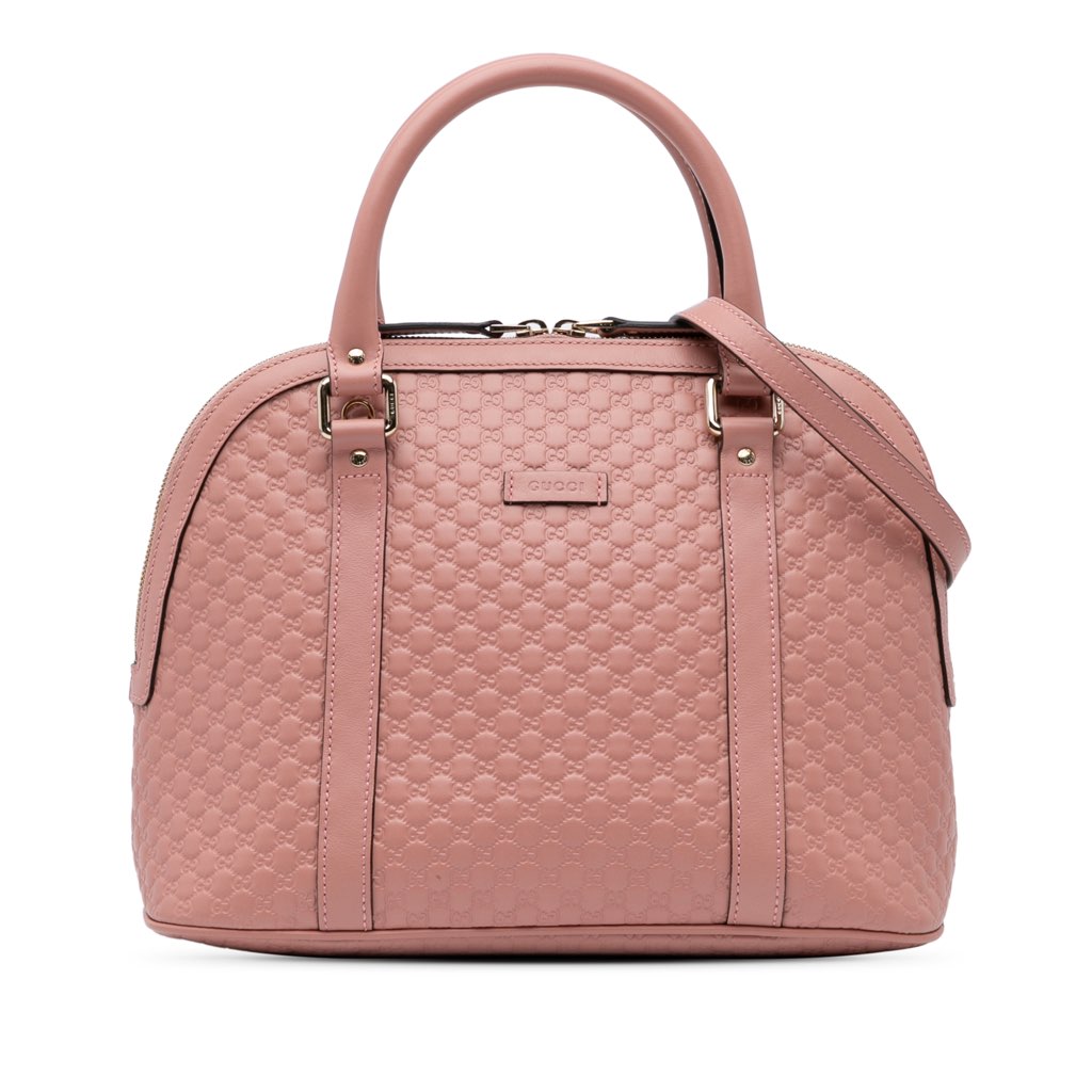 The Dome features an embossed leather body, rolled leather handles, a detachable and adjustable flat leather shoulder strap, a top zip closure, and interior zip and slip pockets.