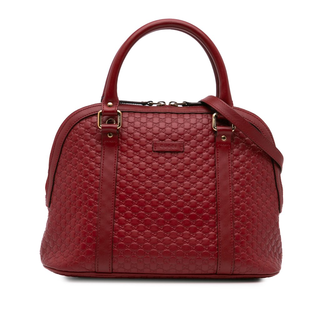 The Dome features an embossed leather body, rolled leather handles, a flat leather shoulder strap, a top zip closure, and interior zip and slip pockets.