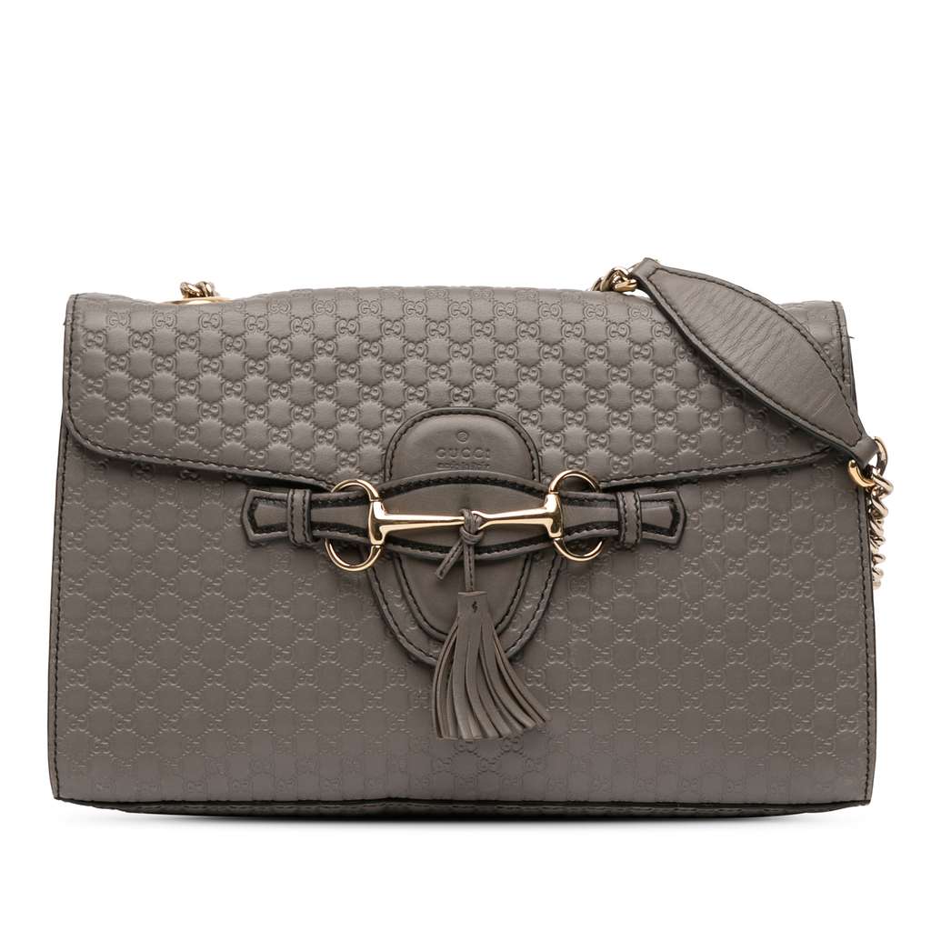 The Emily features an embossed leather body, a curb chain strap, a front flap with a slip-through closure and a tassel detail, and interior slip pockets.