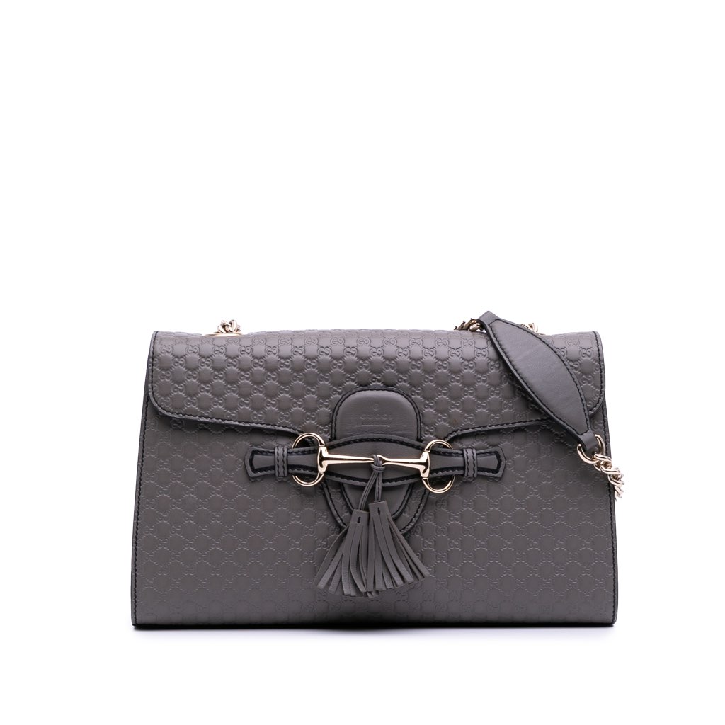 The Emily features an embossed leather body, a curb chain strap, a front flap with a slip-through closure and a tassel detail, and interior slip pockets.