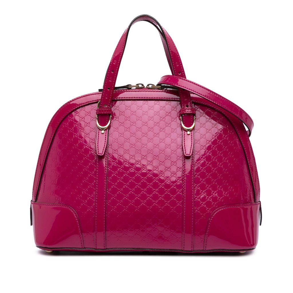 The Nice satchel features a patent leather body, flat leather handles, a detachable leather strap, a top zip closure, and interior slip and zip pockets.
