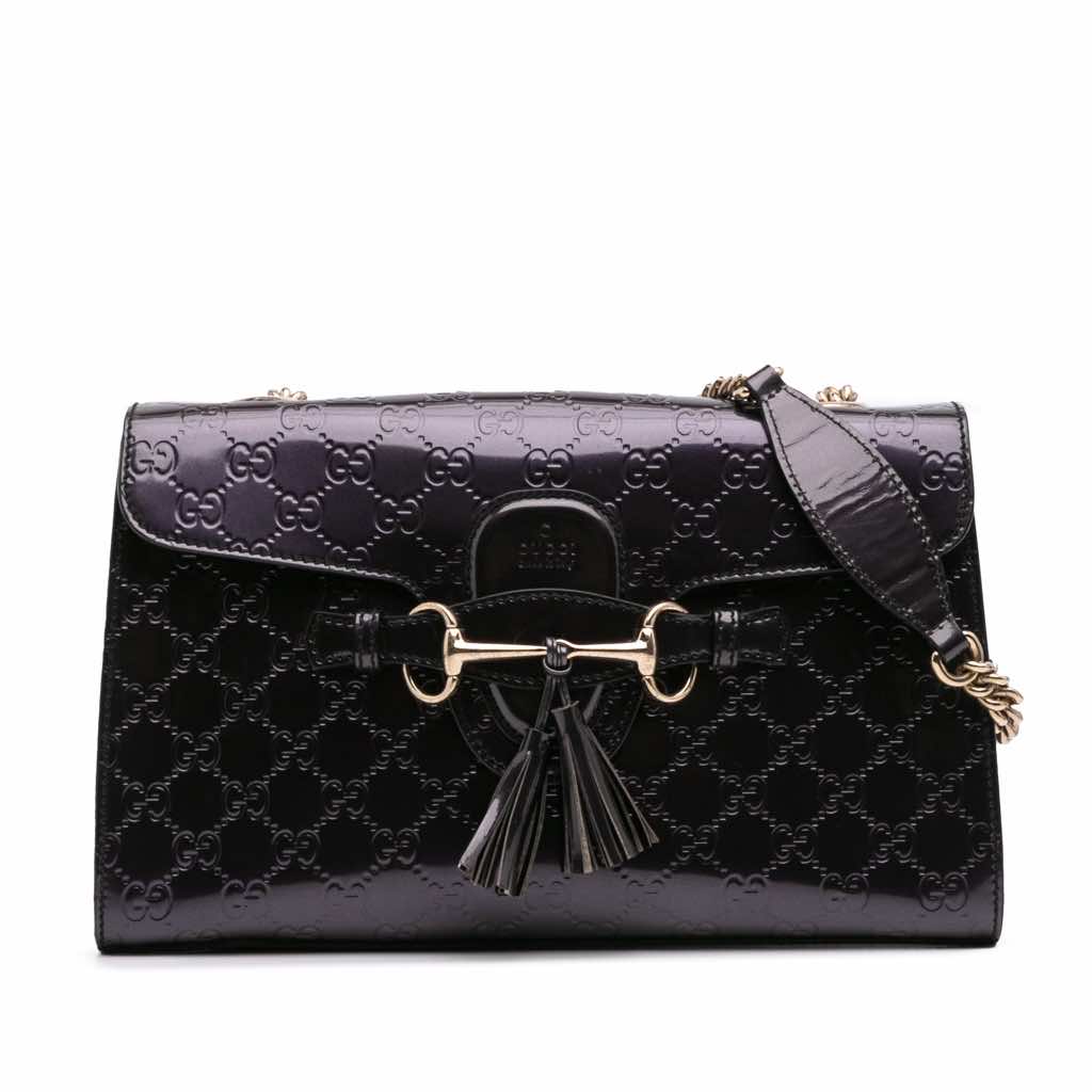 The Emily features an embossed patent leather body, a chain link strap with leather guard, a front flap with a slip-through closure and a tassel detail, and interior slip pockets.