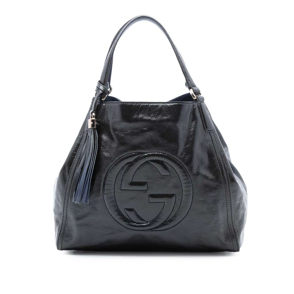 The Soho Cellarius features a patent leather body, flat leather handles, an open top with lobster claw clasp closure, and interior zip and slip pockets.