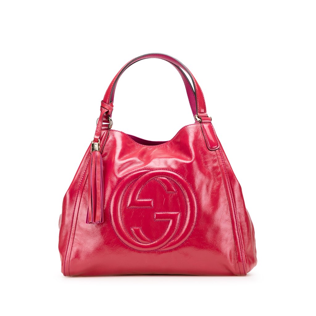 The Soho Cellarius features a patent leather body, flat leather handles, an open top with lobster claw clasp closure, and interior zip and slip pockets.