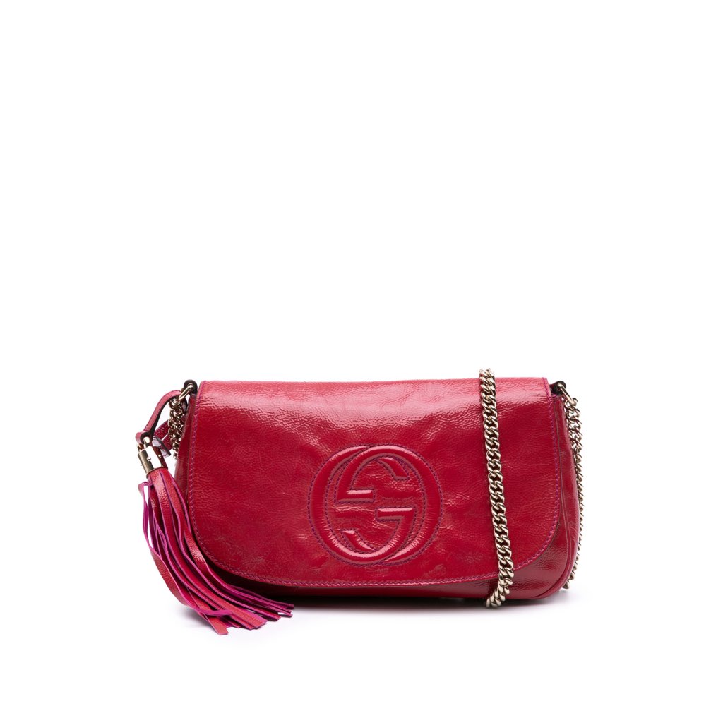 This crossbody bag features a patent leather body, a chain link shoulder strap, a front flap with magnetic closure, and interior zip and slip pockets.