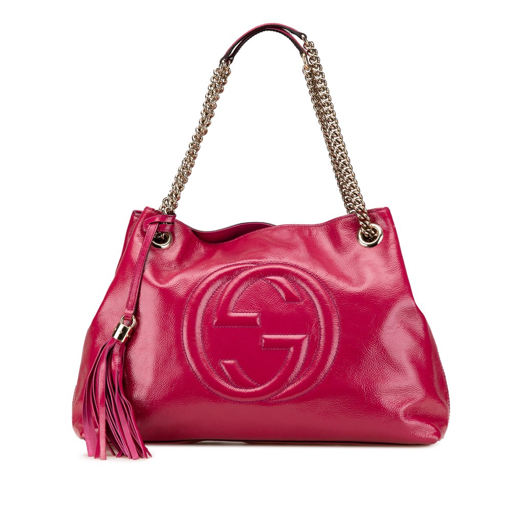 The Soho Chain tote bag features a patent leather body, curb chain straps with leather guard and tassel detail, an open top with hook closure, and interior zip and slip pockets.