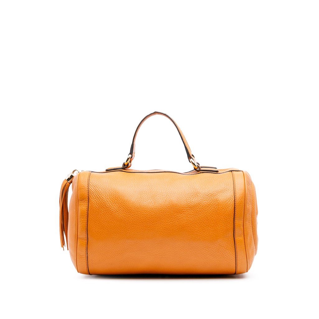 This boston bag features a leather body, flat leather handles, a top zip closure with tassel detail, and an interior zip pocket.