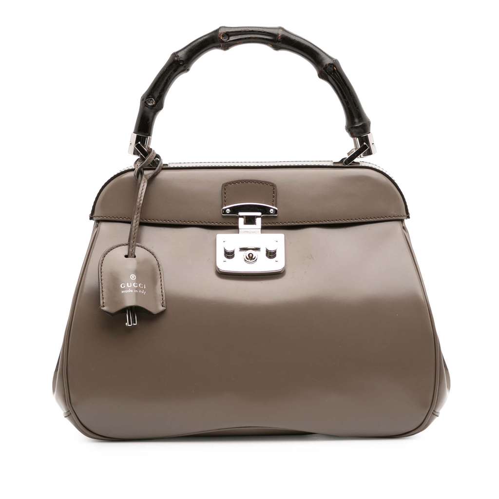 The Lady Lock features a leather body, a bamboo top handle, a top flap with push lock closure, and interior zip and slip pockets.