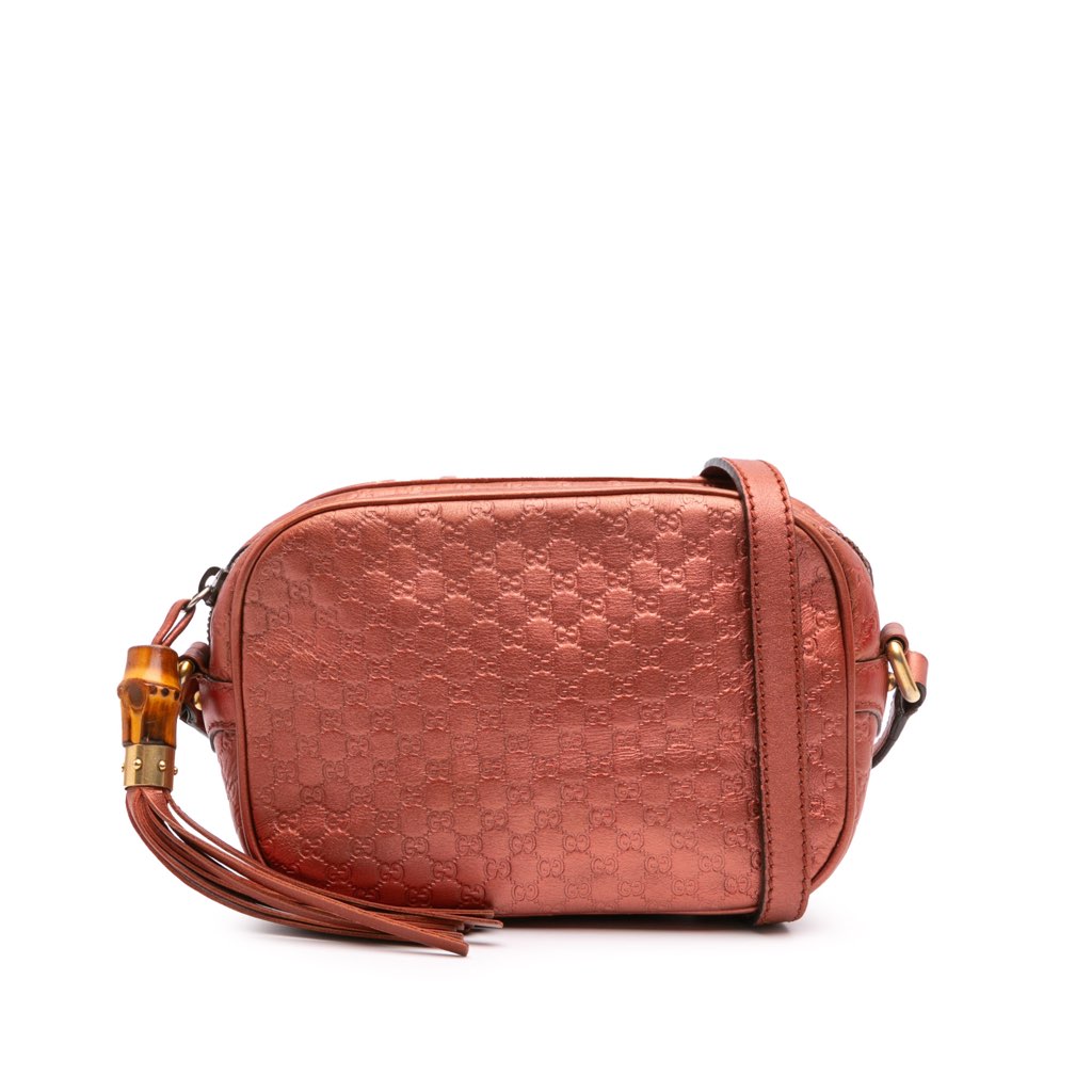 This crossbody features an embossed metallic leather body, an adjustable flat strap, a top zip closure, tassel detail, and interior slip pockets. The exterior front, back and strap were repainted.