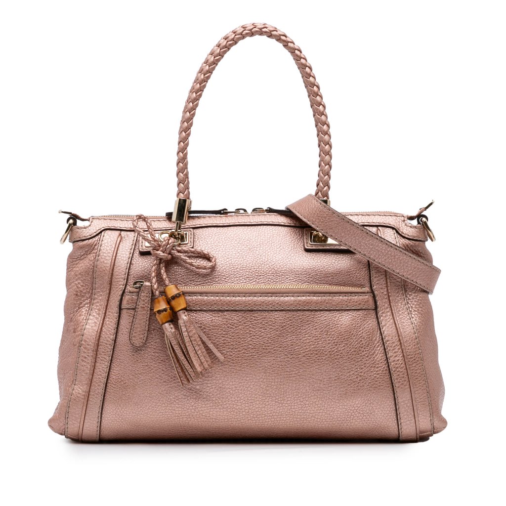 The Bella satchel features a metallic leather body, a leather braided handle, a detachable flat leather strap, a top zip closure, an exterior zip pocket, and interior zip and slip pockets.