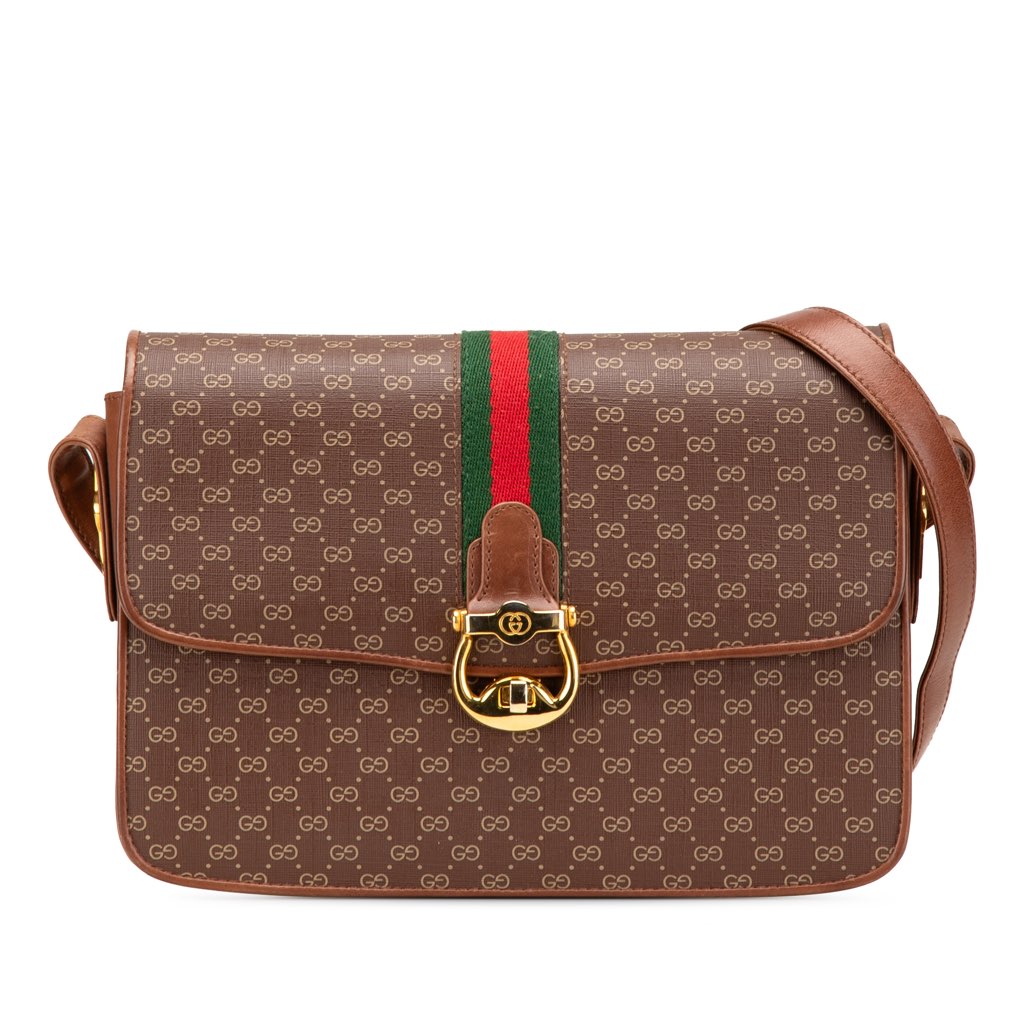This crossbody features a coated canvas body with leather trim and front web detail, an adjustable flat leather strap, a front flap with clasp closure, and an interior zip pocket.