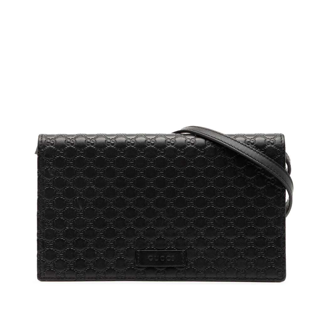 This wallet features an embossed leather body, a detachable flat strap, a front flap with a magnetic closure, and interior zip and slip pockets.