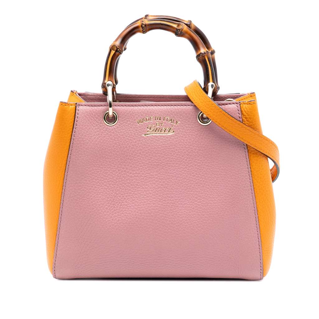 This satchel features a leather body, bamboo top handles, a detachable and adjustable flat leather shoulder strap, an open top with magnetic snap closure, and interior slip pockets.