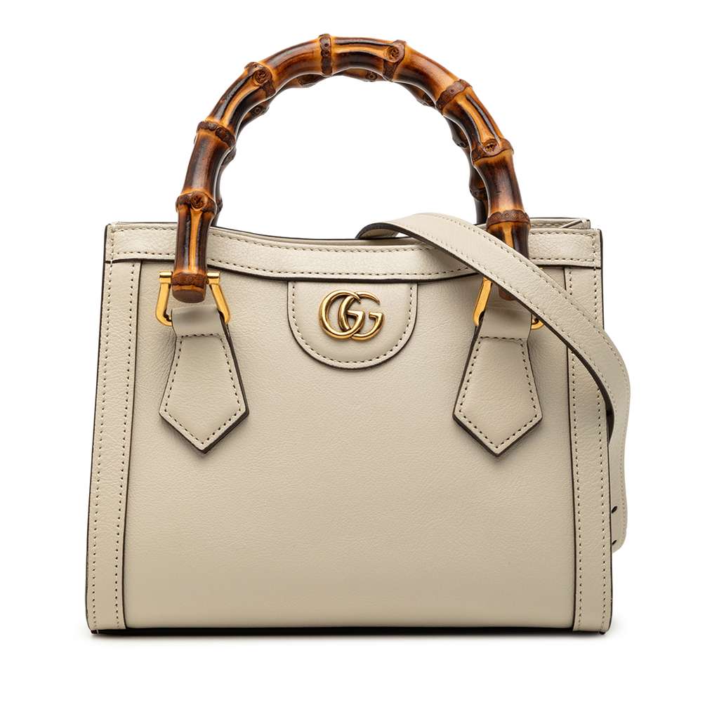 The Diana features a leather body, bamboo handles, a detachable flat leather shoulder strap, and an open top with magnetic snap closure.