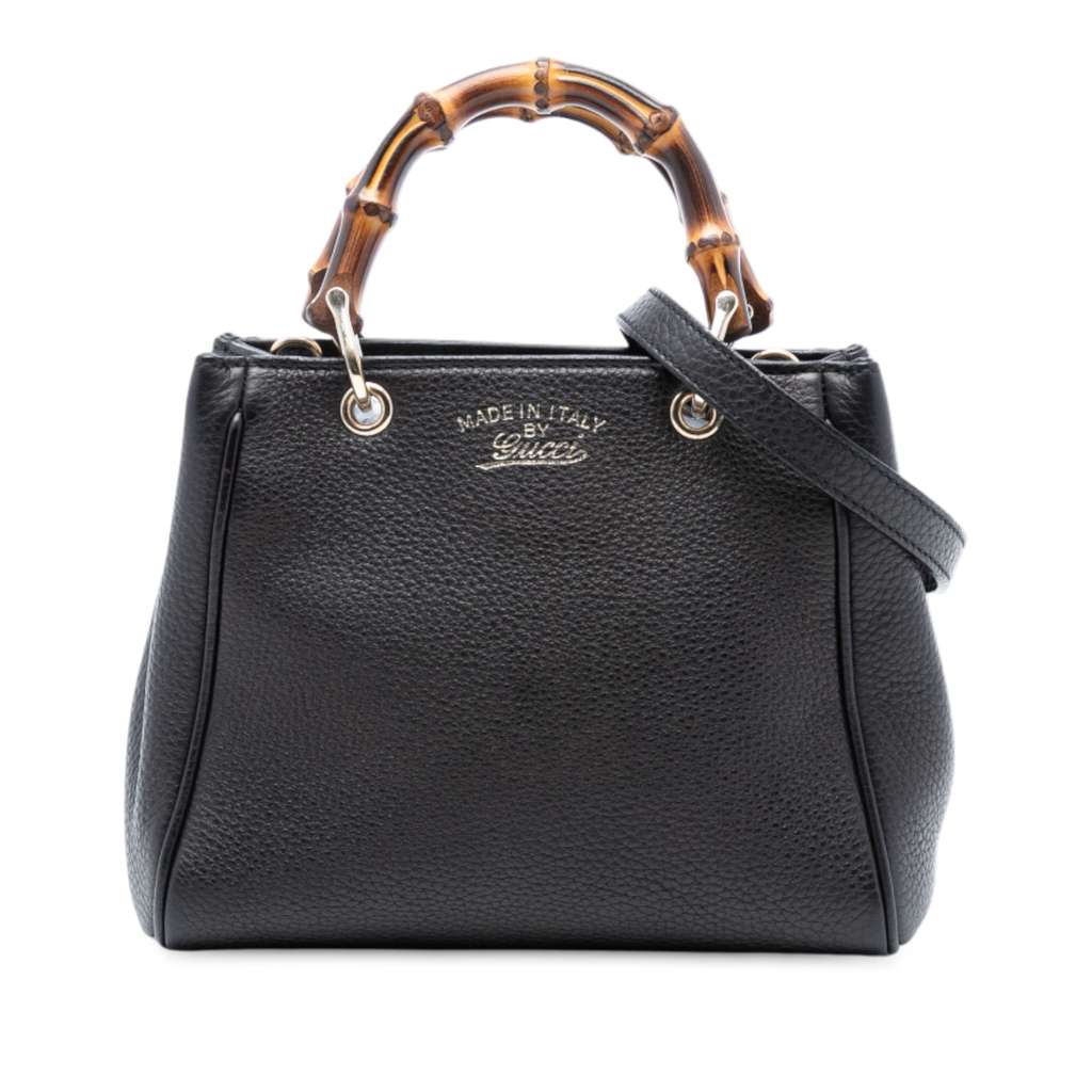 This satchel features a leather body, bamboo top handles, a detachable and adjustable flat leather shoulder strap, an open top with magnetic snap closure, and interior zip and slip pockets.