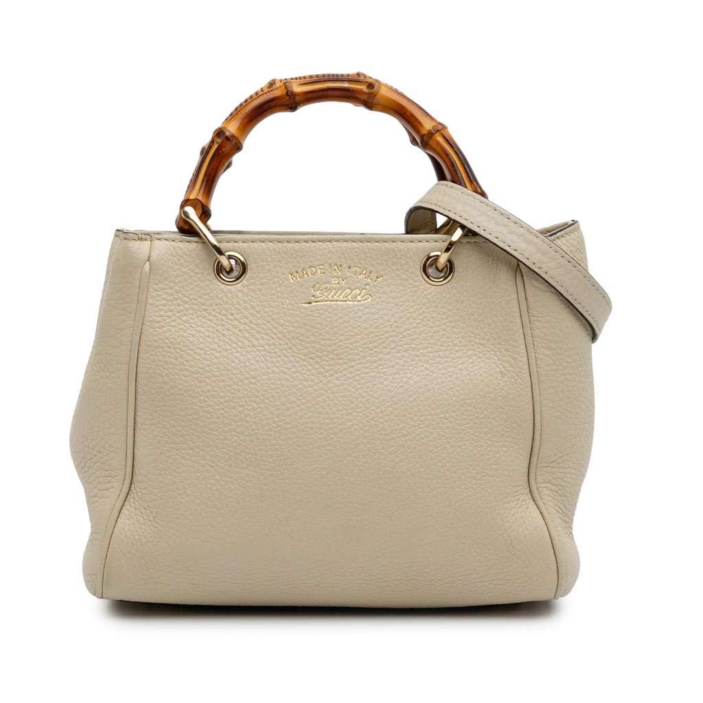 This satchel features a leather body, bamboo top handles, a detachable and adjustable flat leather shoulder strap, an open top with magnetic snap closure, and interior slip pockets.
