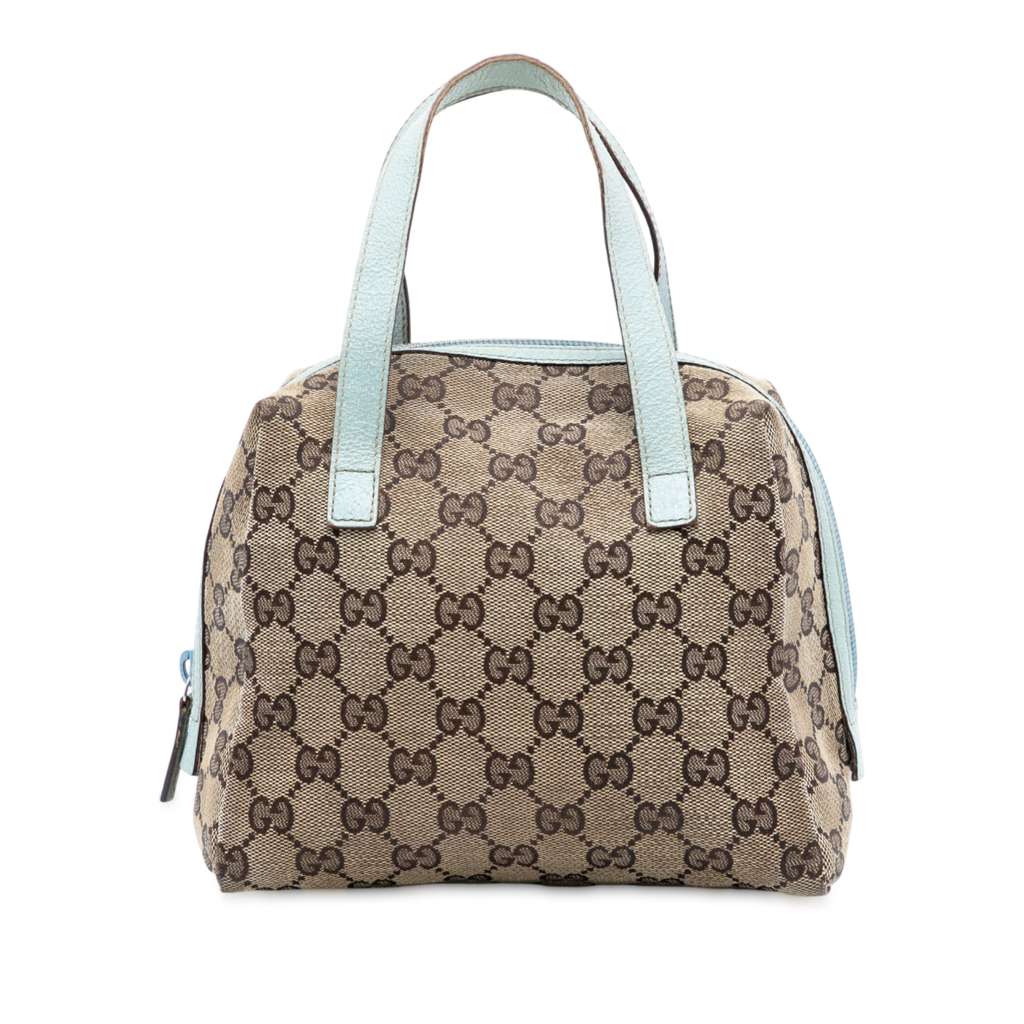 This handbag features a canvas body with leather trim, flat leather handles, a top zip closure, and an interior zip pocket.