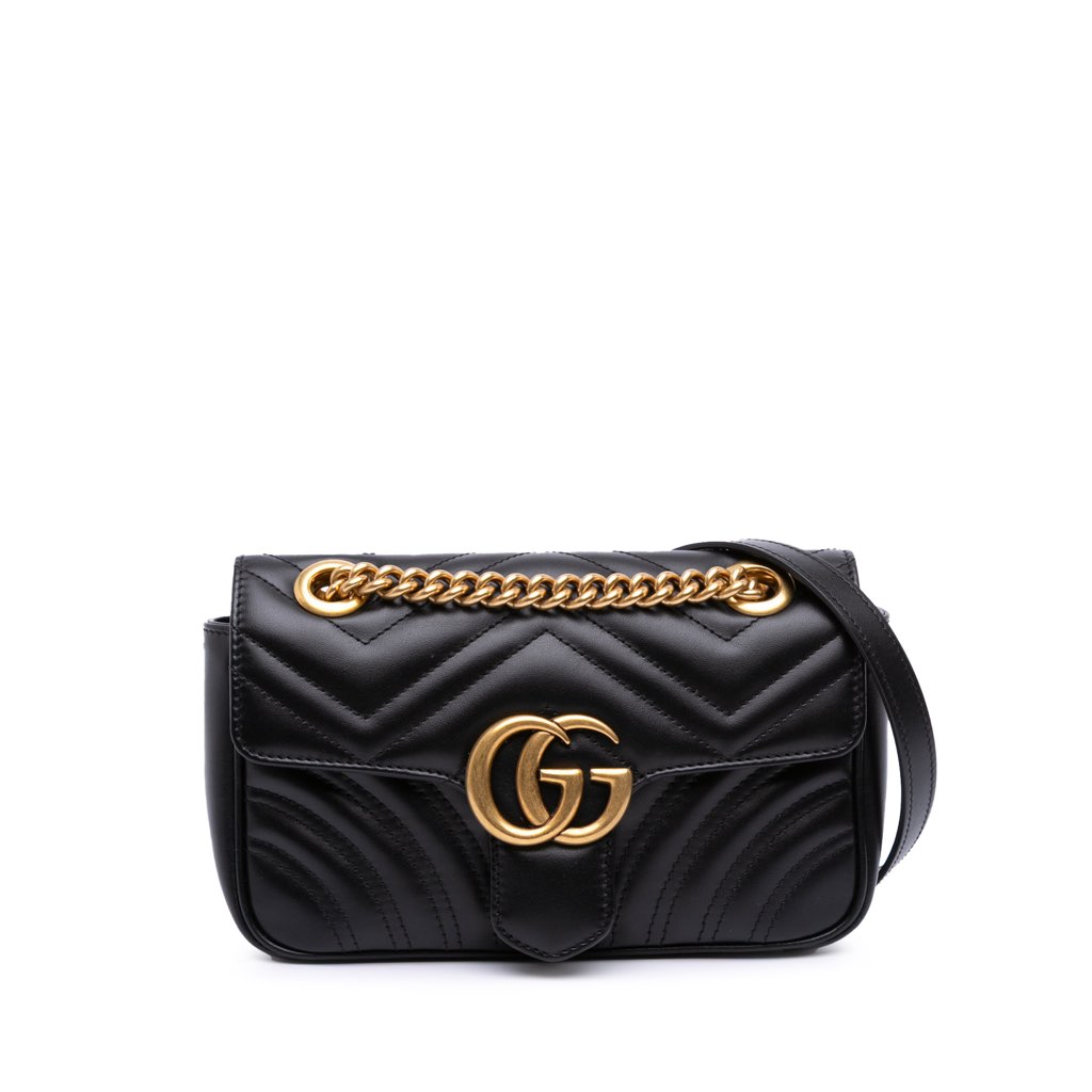 This crossbody bag features a quilted leather body, a curb chain and leather shoulder strap, a front flap with push lock closure, and an interior slip pocket.