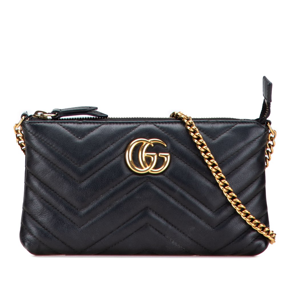 This wallet on chain features a quilted leather body, a chain strap, a top zip closure, and interior zip and slip pockets.