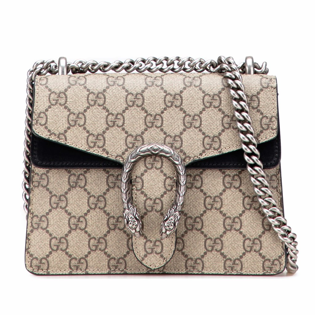 The Mini Dionysus Crossbody bag features a coated canvas body with suede leather trim, a silver-tone chain strap, and a top flap with a magnetic snap button closure..