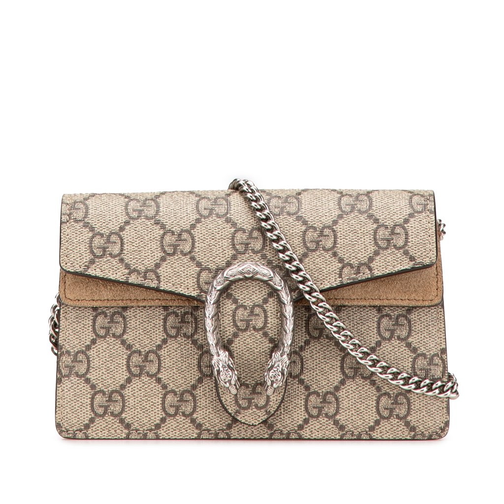 The Dionysus features a coated canvas body with suede leather trim, a silver-tone chain strap, and a top flap with a magnetic snap button closure.